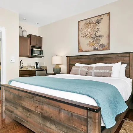 Unwind in the spacious Main Street Retreat #2 accommodations, which feature a luxurious king bed designed for restful nights and rejuvenated mornings. Relish in the delightful atmosphere with natural light flooding the rooms, and enjoy the property's shared hot tub and pool, which provide the ideal space for relaxation after a day of exploration. The thoughtful design of the apartment seamlessly combines comfort with contemporary style.